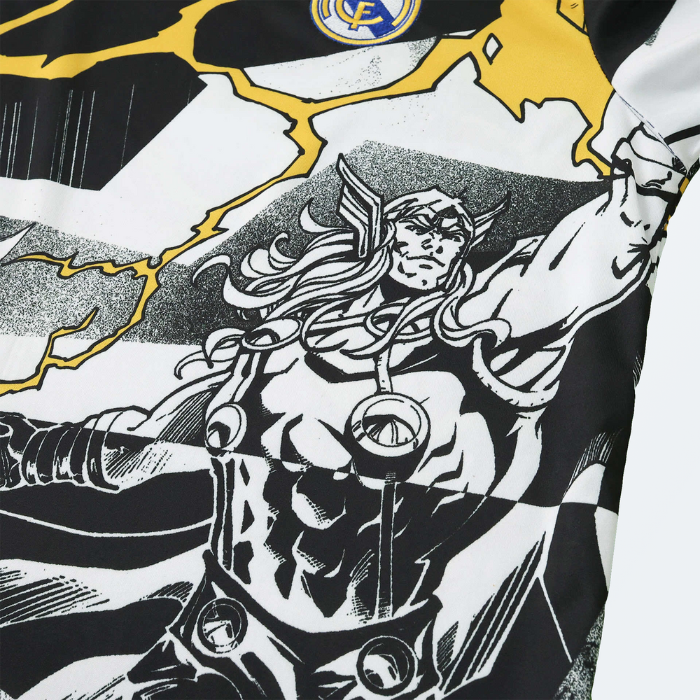 Camisa Real Madrid X Marvel Pré-Jogo 2026 Preta e Branca Edição Especial